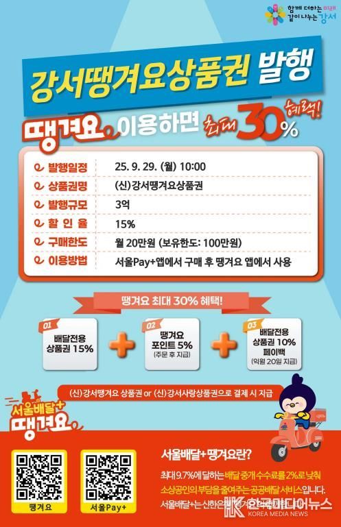 서울 강서구는 오는 29일 공공배달앱 ‘땡겨요’에서 사용가능한 상품권 총 3억 원을 발행한다.