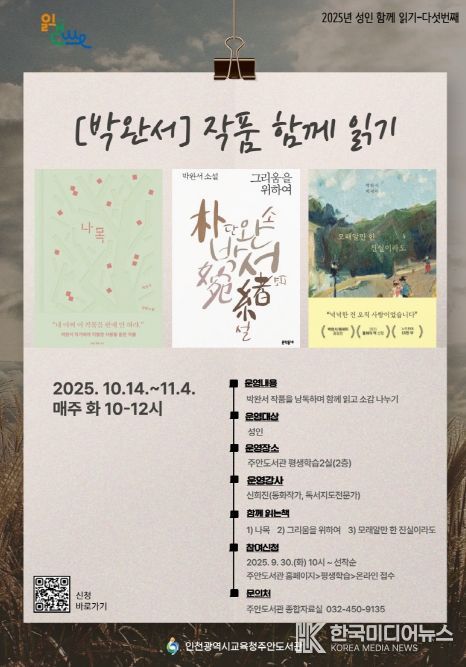 [ 한국미디어뉴스 이원영 기자 ] 인천광역시교육청주안도서관은 10월 14일부터 11월 4일까지 운영하는 ‘2025년 성인 함께 읽기-'박완서 작품 함께 읽기'’ 프로그램 참여자를 모집한다.