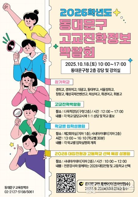 [ 한국미디어뉴스 이보영 기자 ] 서울 동대문구는 오는 10월 18일 토요일 오전 10시부터 오후 5시까지 구청 내 다목적 강당, 제2회의실, 사내아카데미에서'2026학년도 고교 진학정보 박람회'를 개최한다고 밝혔다.