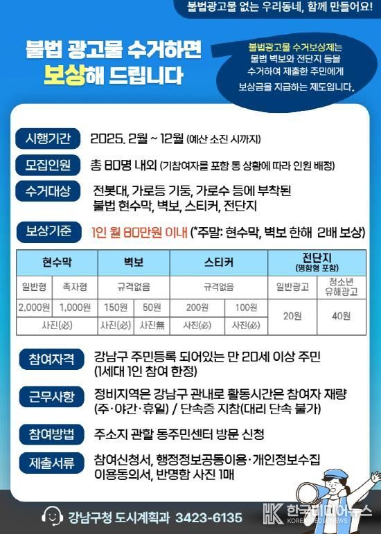 [ 한국미디어뉴스 이보영 기자 ] 꿈이 모이는 도시, 미래를 그리는 강남구가 불법 유동광고물 근절을 위해 운영 중인 ‘수거보상제’의 참여 인원을 대폭 확대한다. 구는 주민 약 60명을 새롭게 모집해 더 많은 주민이 직접 거리 정비에 나설 수 있도록 했다.
