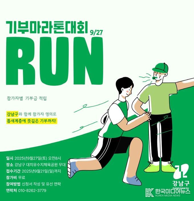 [ 한국미디어뉴스 이보영 기자 ] 꿈이 모이는 도시, 미래를 그리는 강남구가 오는 9월 27일 오전 9시부터 오후 2시 30분까지 양재천 일대에서 ‘기부-Run 강남 달리기’ 행사를 개최한다. 이 행사는 참가자의 걸음과 달리기가 기부로 이어지는 기부 연계형 건강 캠페인으로, 건강한 나눔을 실천하는 지역사회 공헌 프로그램이다.