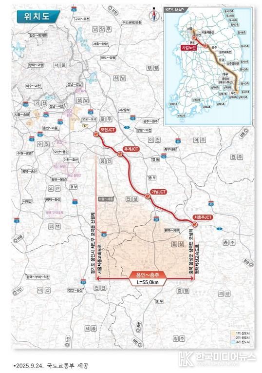 국토교통부에 따르면 안성과 용인-음성-충주를 연결하는 민자고속도로는 손익 공유형(BTO-a) 방식으로 추진되며, 총연장 약 55km, 왕복 4차로, 설계속도는 시속 110km
