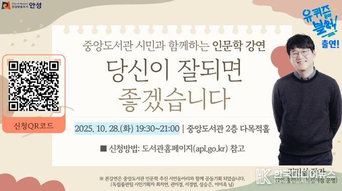 [ 한국미디어뉴스 이보영 기자 ] 안성시는 오는 10월 28일 저녁 7시 30분, 중앙도서관 다목적홀에서 정미소출판사 대표이자 『당신이 잘되면 좋겠습니다』의 저자 김민섭 작가를 초청해 시민 강연회를 개최한다.