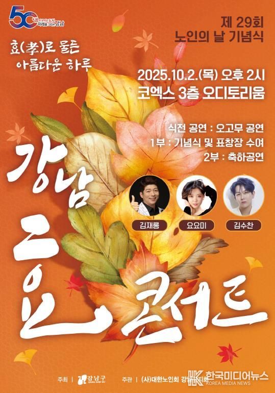 [ 한국미디어뉴스 이보영 기자 ] 꿈이 모이는 도시, 미래를 그리는 강남구가 제29회 노인의 날을 맞아 오는 10월 2일 오후 2시, 코엑스 3층 오디토리움에서 어르신 1,000여 명을 초대해 ‘효(孝)로 물든 아름다운 하루’를 주제로 기념행사를 연다.