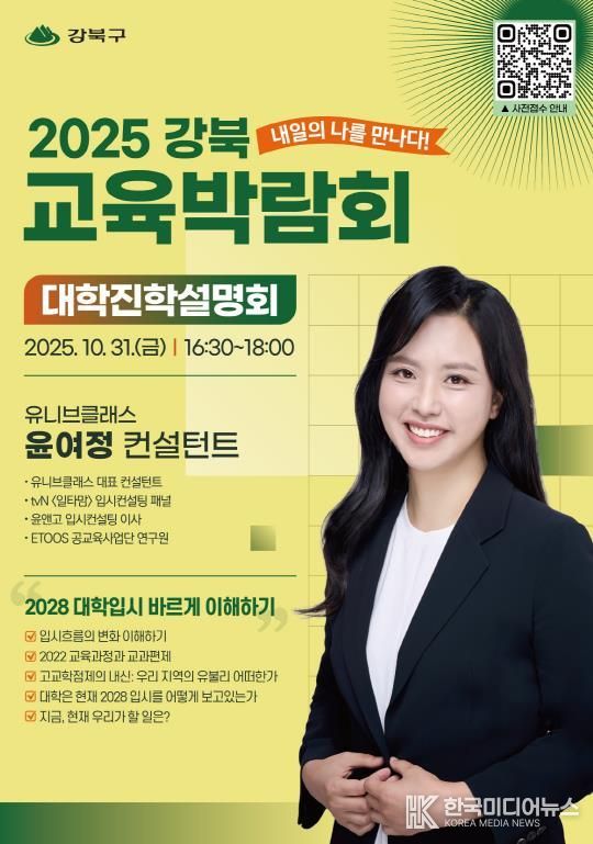 한편, '2025 강북 교육박람회'는 10월 31일 오전 9시부터 오후 6시까지 강북구청 대강당과 광장 일대에서 열리며, 고교 진학 설명회, 진로 토크 콘서트, 적성검사, 미래 과학기술 체험부스 등 다채로운 프로그램이 진행될 예정이다.