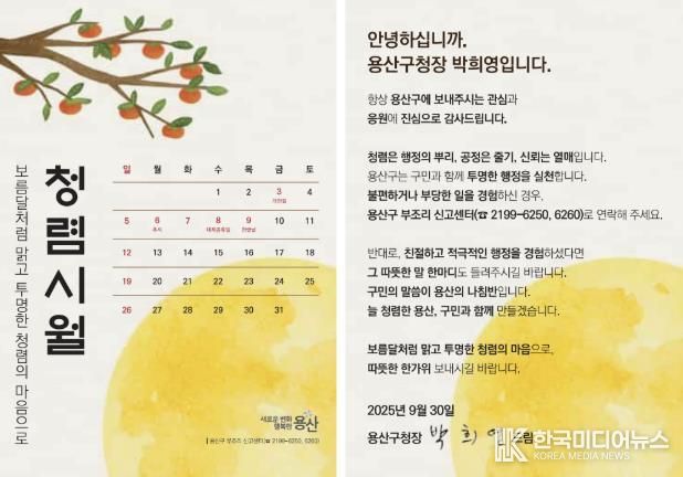 특히 긴 추석 연휴 기간을 맞아 구는 이번 ‘청렴시월 서한문’을 통해 구민에게 투명하고 공정한 행정의 메시지를 전하고 있다. 박희영 구청장은 “청렴은 행정의 뿌리이자 신뢰를 지켜내는 힘”이라며 “이번 청렴 서한문이 명절의 따뜻한 마음과 어우러져, 구민과 함께 더 청렴한 용산을 만들어가는 계기가 되길 바란다”라고 강조했다.