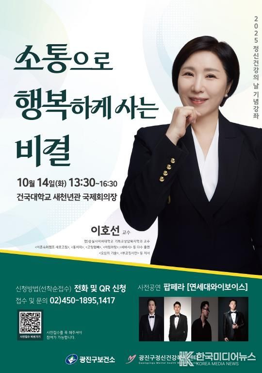 [ 한국미디어뉴스 이보영 기자 ] 광진구는 오는 10월 14일 ‘정신건강의 날(매년 10월 10일)’을 맞아 건국대학교 새천년관 국제회의장에서 광진구정신건강복지센터 주관 기념 강좌를 개최한다.