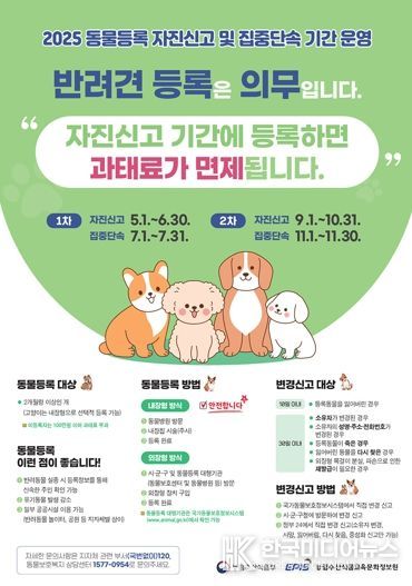 구는 소유자의 자발적 동물등록을 유도하고 등록 미비로 발생하는 각종 문제를 사전에 차단하기 위해 자진신고 기간을 운영하고 있으며, 이 기간에 신규 등록하거나 변경사항을 신고하면 미등록·미신고에 따른 과태료를 면제하고 있다.