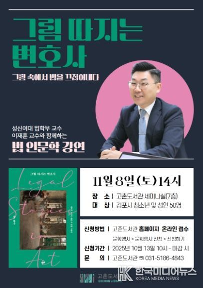 [ 한국미디어뉴스 이원희 기자 ] 김포시 고촌도서관에서 오는 11월 8일 오후 2시부터 4시까지 예술작품 속에 숨은 법률 이야기를 주제로 한 인문학 강연을 운영한다.