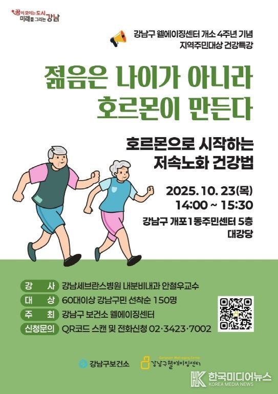 이번 특강은 지난 5월 강남구웰에이징센터에서 열린 ‘불멸의 호르몬으로 활기찬 노년을!’ 강연이 큰 호응을 얻은 데 힘입어 기획된 후속 프로그램이다. 최근 건강관리 트렌드로 주목받는 ‘저속노화’ 개념을 바탕으로, 일상에서 실천 가능한 호르몬 중심의 건강 전략을 주민들에게 소개할 예정이다.