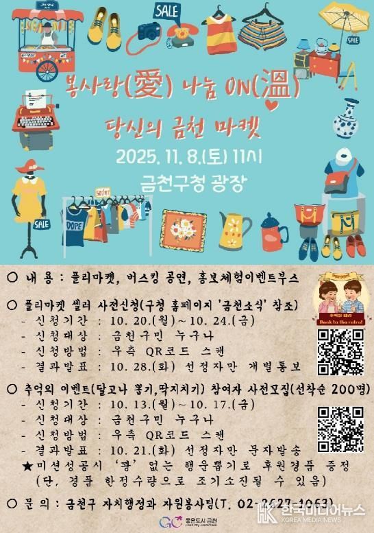 [ 한국미디어뉴스 이보영 기자 ] 금천구는 오는 11월 8일 금천구청 광장 앞에서 ‘봉사랑(愛) 나눔ON(溫), 당신의 금천마켓’을 연다고 밝혔다.