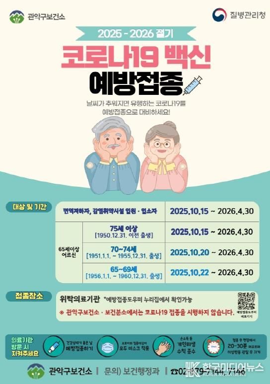 [ 한국미디어뉴스 이보영 기자 ] 관악구가 호흡기 질환이 증가하는 동절기 대비, 코로나19 감염 고위험군을 대상으로 코로나19 백신 무료 접종을 실시한다.