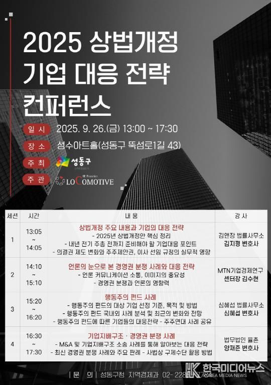 [ 한국미디어뉴스 이보영 기자 ] 서울 성동구는 지난달 26일 성수타운매니지먼트(Seongsu Town Management) 사업의 일환으로 진행된 '2025 상법개정과 기업의 대응전략' 컨퍼런스를 성공적으로 마쳤다고 밝혔다.