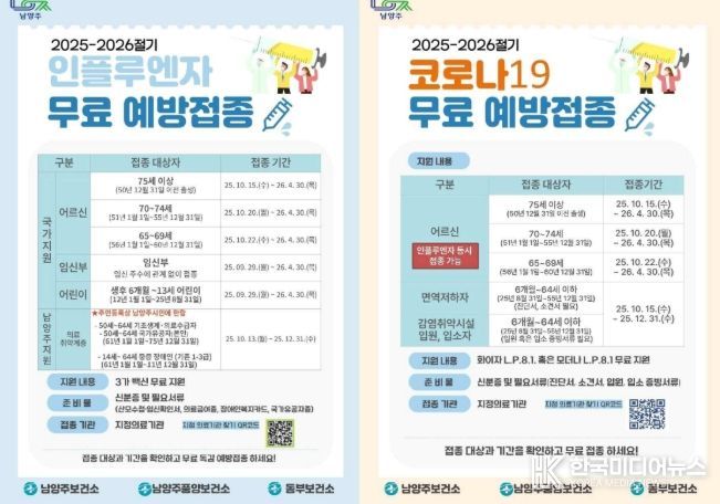 한편, 접종 일정과 지정 의료기관, 대상자 조건 등 자세한 사항은 남양주시 블로그, 보건소 누리집 등을 통해 확인할 수 있다.