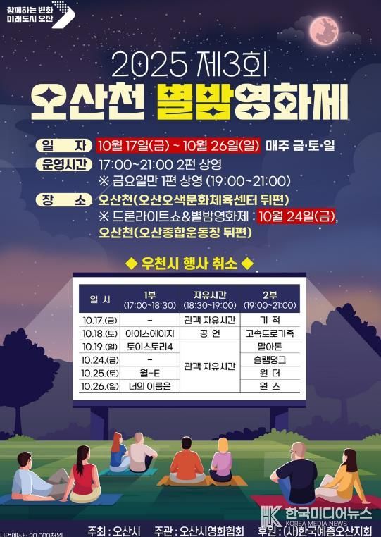 [ 한국미디어뉴스 이보영 기자 ] 오산시는 오는 10월 17일부터 26일까지 매주 금·토·일 저녁, 오산천(오색문화체육센터 뒤편)에서 시민들이 야외에서 영화를 즐길 수 있는 '2025 제3회 오산천 별밤영화제'를 개최한다고 밝혔다.