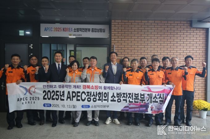 [ 한국미디어뉴스 이원영 기자 ] 경상북도 소방본부는 2025년 에이펙(APEC) 정상회의의 성공적 개최와 참가국 정상단의 안전 확보를 위해 지난 13일 경주소방서 대회의실에서 ‘에이펙(APEC) 소방작전본부 출범식’을 가졌다.
