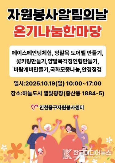 [ 한국미디어뉴스 최치남 기자 ] 인천중구자원봉사센터(센터장 최윤호)는 오는 19일 오전 10시부터 오후 5시까지 영종하늘도시 별빛광장에서 ‘자원봉사 알림의 날 – 온기나눔한마당’ 행사를 개최한다고 밝혔다.