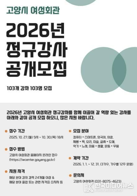 [ 한국미디어뉴스 문상수 기자 ] 고양특례시 여성회관에서 2026년 정규강좌 운영을 위한 정규강사진을 공개 모집한다.