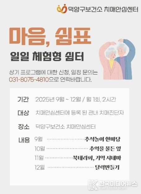 [ 한국미디어뉴스 문상수 기자 ] 고양특례시 덕양구보건소 치매안심센터는 정규 쉼터 프로그램 참여가 어려운 관내 치매 어르신을 대상으로, 일일 체험형 쉼터 프로그램 ‘마음, 쉼표’를 12월까지 운영한다고 밝혔다.