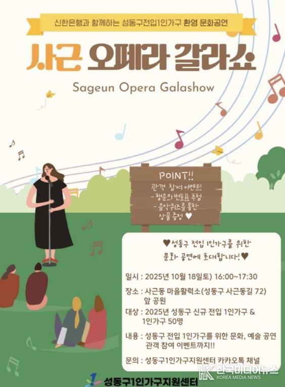 정원오 성동구청장은 “최근 급증하는 1인가구가 지역사회에서 안정적으로 자리 잡을 수 있도록 다양한 지원정책과 교류의 장을 마련하고 있다”라며 “이번 음악회가 새 이웃과 지역사회 간 소통의 장이 되길 바란다”라고 말했다.
