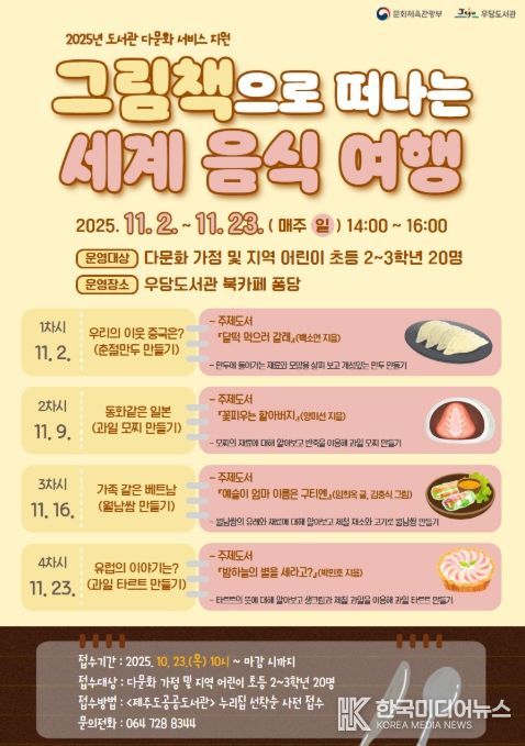 [ 한국미디어뉴스 이원영 기자 ] 제주시 우당도서관은 2025년 도서관 다문화 서비스 지원 사업인 ‘그림책으로 떠나는 세계 음식 여행’ 프로그램 참여자를 10월 23일부터 선착순 모집한다.