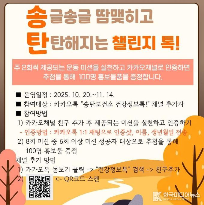 [ 한국미디어뉴스 이보영 기자 ] 평택시 송탄보건소는 10월 20일부터 11월 14일까지 카카오톡을 활용한 ‘(송)글송글 땀 맺히고 (탄)탄해지는 챌린지 톡!’을 운영할 예정이라고 밝혔다.