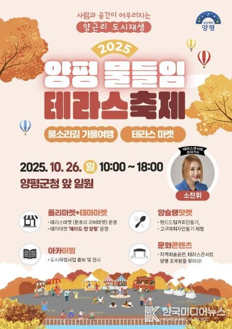 [ 한국미디어뉴스 김서안 기자 ] 양평군은 오는 10월 26일, 양평군청 앞 특설무대 및 주차장 일원에서 ‘2025 양평 물들임 테라스 축제’를 개최한다고 밝혔다.