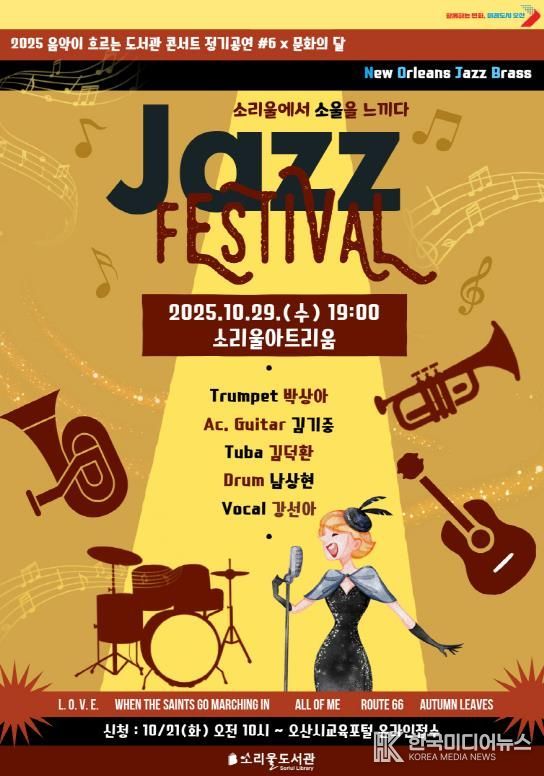 [ 한국미디어뉴스 이보영 기자 ] 경기도 오산시는 오는 10월 29일 오후 7시, 소리울도서관 3층 소리울아트리움에서 '2025 음악이 흐르는 도서관 콘서트 정기공연 #6 × 문화의 달 – Jazz Festival; 소리울에서 소울을 느끼다'를 개최한다고 밝혔다.