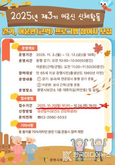 [ 한국미디어뉴스 이보영 기자 ] 광명시 보건소는 지역 어르신들의 건강한 노후를 지원하기 위해 ‘2025년 제3기 어르신 신체활동 프로그램’을 오는 20일부터 23일까지 4일간 모집한다.