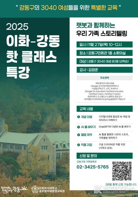 이수희 강동구청장은 “3040 세대 여성들이 디지털 시대에 꼭 필요한 AI 역량을 쉽게 키울 수 있도록 실습 중심의 교육을 마련했다”라며, “‘이화강동 핫 클래스’에 대한 높은 호응에 힘입어, 내년부터 확대 운영을 검토하고 있으며, 앞으로도 구민의 일상에 실질적인 도움이 되는 프로그램을 지속 발굴 운영해가겠다”라고 말했다.