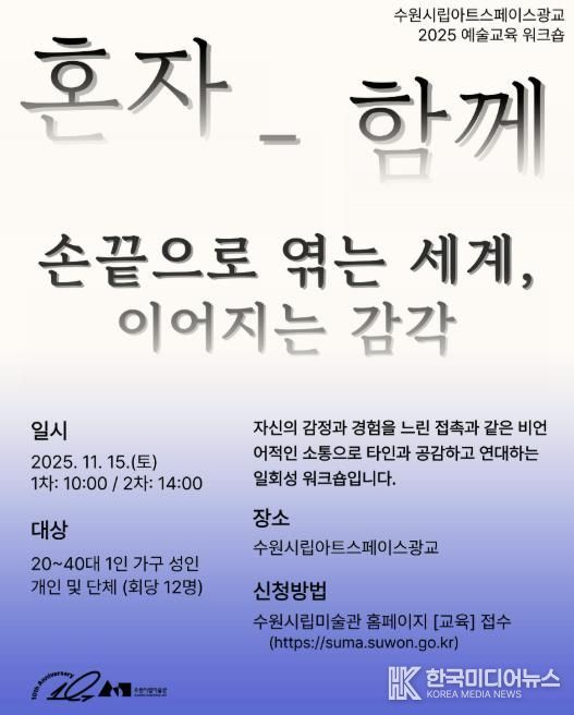 [ 한국미디어뉴스 이보영 기자 ] 경기도 수원시립미술관은 예술을 통해 타인과의 관계를 확장하고 감각을 회복하는 예술교육 워크숍 '혼자-함께'를 11월 15일 수원시립아트스페이스광교에서 개최한다.