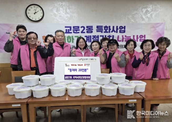한편, ‘행복 더하기 계절 김치 나눔 사업’은 2023년부터 매년 이어지고 있는 교문2동 지역사회 보장협의체의 대표 복지 특화사업으로, 계절별로 맞춤형 김치를 담가 관내 취약계층에 전달해 큰 호응을 얻고 있다. 협의체는 올겨울에도‘겨울 계절 김치 나눔’을 추진해 지역 내 소외된 이웃들에게 따뜻한 마음을 전할 예정이다.