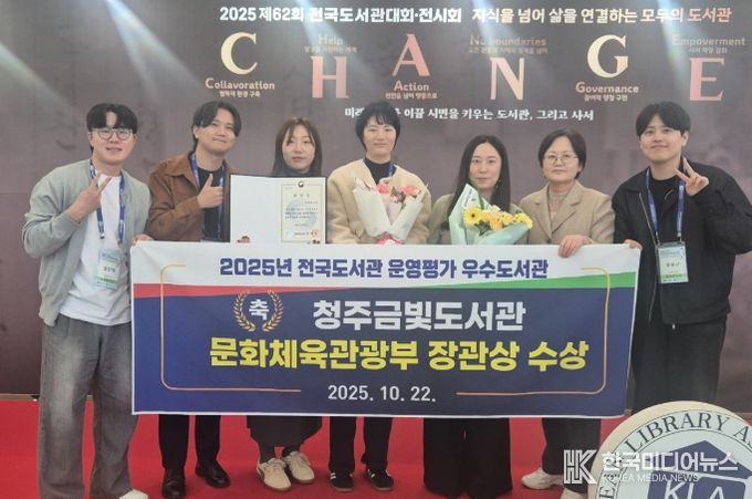 [ 한국미디어뉴스 김풍옥 기자 ] 청주금빛도서관은 22일 수원시 컨벤션센터에서 열린 제62회 전국도서관 대회에서 ‘2025년 도서관 운영 유공’ 우수 도서관으로 선정돼 문화체육관광부 장관상을 수상했다.
