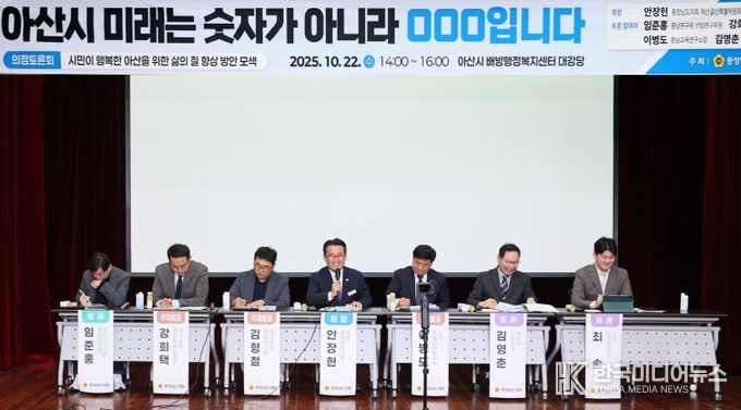 도의회는 22일 아산시 배방행정복지센터 대강당에서 ‘아산시 미래는 숫자가 아니라 ○○○입니다’를 주제로 의정토론회를 개최했다. 토론회 좌장인 안장헌 의원(아산5·더불어민주당)은 “도시의 발전은 숫자와 순위로 평가되는 것이 아니라 시민의 일상 속 행복으로 증명돼야 한다”며 “오늘 이 토론회가 시민의 생각이 정책으로 이어지는 계기가 되길 바란다”고 말했다.
