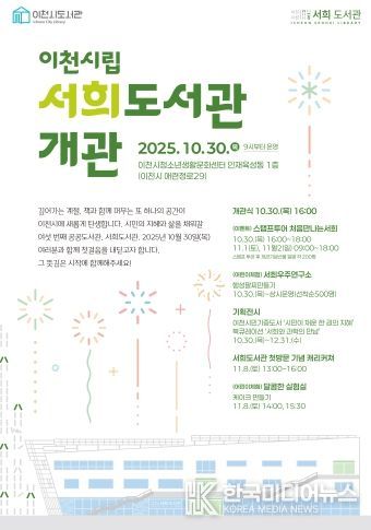 [ 한국미디어뉴스 이보영 기자 ] 이천시는 오는 10월 30일, 시민들의 지식과 문화 향유를 위한 새로운 공간인 ‘이천시립서희도서관’을 공식 개관한다고 밝혔다.