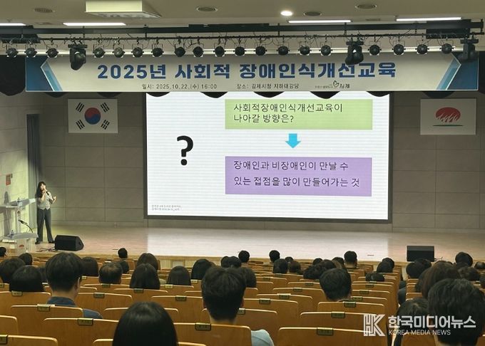 [ 한국미디어뉴스 이종철 기자 ] 김제시는 22일 시청 지하 대강당에서 전직원을 대상으로 장애인에 대한 올바른 이해와 장애 공감 문화 조성을 위한 ‘사회적 장애인식개선교육’을 진행했다고 밝혔다.