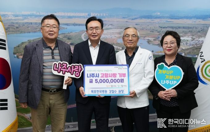 [ 한국미디어뉴스 이종철 기자 ] 전라남도 나주시는 22일 목포한국병원 강철수 원장(오른쪽 두 번째)이 지역사회 발전을 위해 고향사랑기부금 500만 원을 기탁했다고 밝혔다.