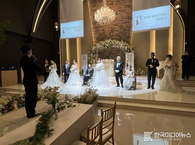 [ 한국미디어뉴스 이보영 기자 ] 경상북도는 한국장애인재활협회 경북협회 주관으로 22일 경북 안동 두리원웨딩홀에서 신랑·신부 5쌍과 가족, 친지, 내빈 등 120여 명이 참석한 가운데 ‘제30회 경상북도 장애인 합동결혼식’을 성황리에 개최했다.