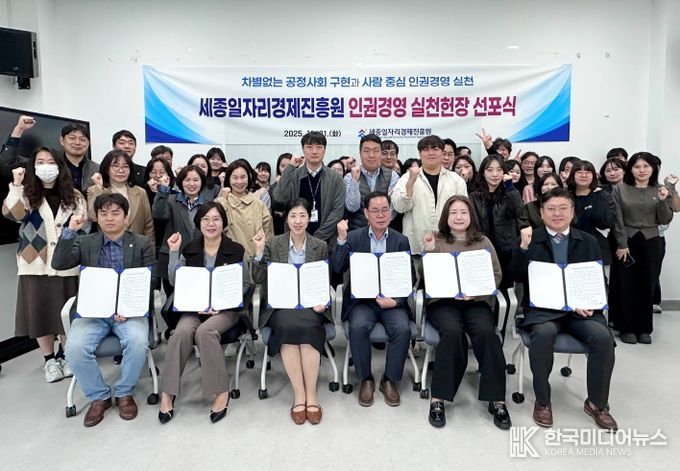 [ 한국미디어뉴스 이보영 기자 ] 세종일자리경제진흥원(원장 이홍준)은 21일 본원 2층 교육실에서 ‘인권경영 실천헌장 선포식’을 열고 모든 임직원이 인권을 경영의 핵심 가치로 삼아 실천해 나갈 것을 다짐했다.