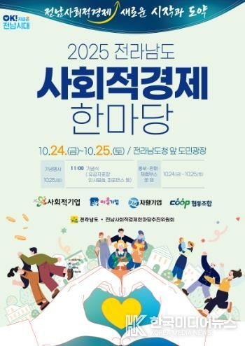[ 한국미디어뉴스 이종철 기자 ] 전라남도가 24~25일 도청 앞 도민광장에서 ‘2025년 전남 사회적경제 한마당’ 행사를 개최한다.