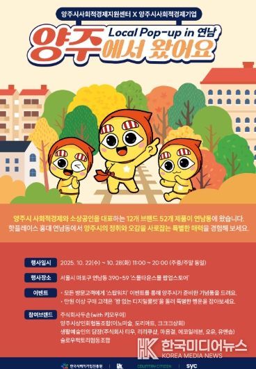 ‘양주에서 왔어요(Local Pop-up in 연남)’는 10월 22일 28일 오전 11시부터 오후 8시까지(주중·주말 동일) 운영되며, 방문객을 위한 ‘스탬프 이벤트’와 ‘양주시 디지털 룰렛 경품 행사’ 등 다양한 체험 이벤트도 함께 진행한다.