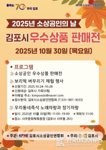 [ 한국미디어뉴스 이원희 기자 ] 김포시소상공인연합회에서 오는 10월 30일 사우문화체육광장에서 지역 소상공인의 우수상품을 소개하는 ‘2025 김포시 소상공인 우수상품 판매전’을 개최한다.