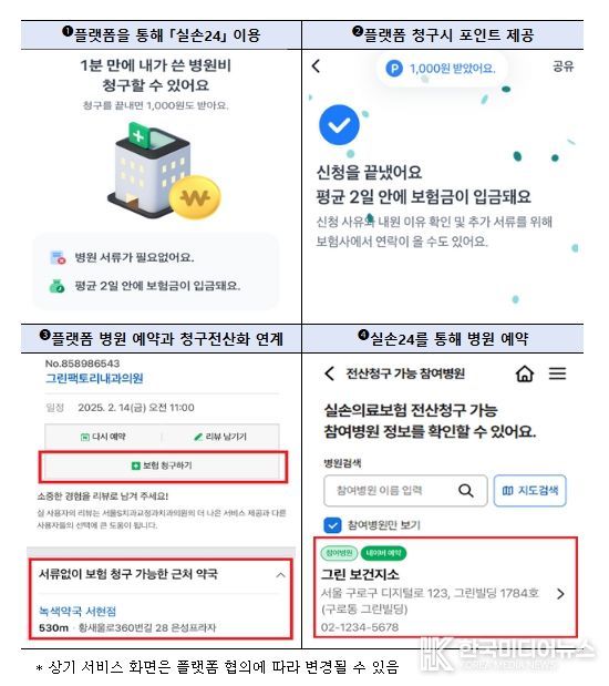국민 대다수가 이용하는 온라인 플랫폼(네이버, 토스 등)을 이용하여 청구전산화 서비스를 쉽게 이용할 수 있게 하는 데도 노력을 기울일 계획이다. 전산개발을 거쳐 빠르면 ’25.11월부터 ➊플랫폼 앱을 통해 「실손24」 서비스를 동일하게 이용 가능하며, 실손24 앱 설치 없이도 가입 보험사 조회부터 보험금 청구까지 플랫폼 내에서 모든 과정을 진행할 수 있게 된다. ➋플랫폼을 통한 「실손24」 청구건에 대하여는 소비자에게 별도로 포인트 캐시백을 제공*할 예정이다. ➌또한, 향후 플랫폼이 제공하고 있는 고유 서비스(예: 병원 예약)와도 연계하여 병원 예약부터 보험금 청구까지 One-stop으로 진행할 수 있도록 서비스를 보다 편리하게 개선할 계획이다. ➍한편, 「실손24」를 통해서도 플랫폼(예: 네이버)의 병원 예약 서비스를 이용할 수 있는 상호간 서비스 연계는 이미 활용할 수 있다.