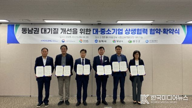 [ 한국미디어뉴스 이원영 기자 ] 경남도는 23일 낙동강유역환경청 대회의실에서 효성중공업(주), 낙동강유역환경청, 김해시, 양산시, 함안군과 함께 『대·중소기업 지역대기질 개선 상생협력 사업 연도별 참여 확약식』을 체결했다고 밝혔다.