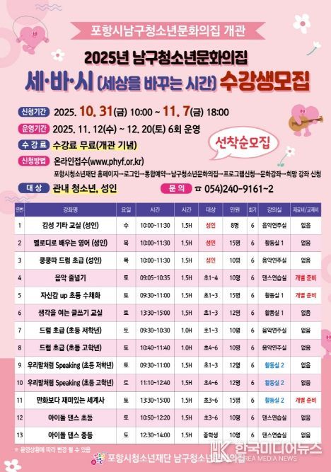 [ 한국미디어뉴스 이보영 기자 ] 포항시청소년재단은 27일 남구 청소년문화의집 개관을 기념해 ‘세·바·시(세상을 바꿀 시간)’ 프로그램 수강생을 모집한다고 밝혔다.