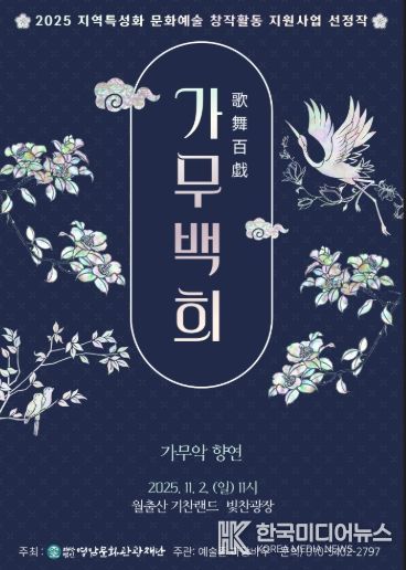 [ 한국미디어뉴스 이원영 기자 ] 영암의 가을들녘에 가무악의 정수를 더한다. (재)영암문화관광재단은 ‘2025 지역특성화 문화예술 창작활동지원’사업의 일환으로, 지역 예술단체인 ‘예술촌 마당바우’(대표: 문치빈)과 함께 오는 11월 2일 일요일 오전 11시, 월출산 기찬랜드 빛찬광장에서 전통무용 공연을 개최한다.