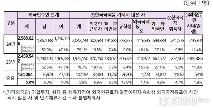 통계가 처음 발표된 2006년 이후 매년 증가했으며, 지난해 246만 명으로 외국인주민 수가 역대 최다를 기록한 데 이어, 2024년도 외국인주민 수도 증가세를 지속하며 사상 최대 규모를 다시 경신했다.