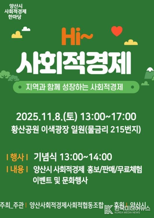[ 한국미디어뉴스 이원영 기자 ] 양산시는 오는 8일 오후 1시부터 오후 5시까지 황산공원 이색광장 일원에서 2025년 사회적경제 한마당(부제‘Hi~ 사회적경제’) 행사를 개최한다.