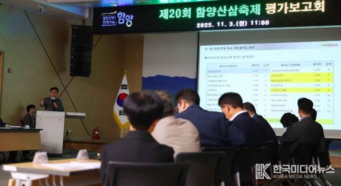 [ 한국미디어뉴스 이원영 기자 ] 함양군은 11월 3일 군청 대회의실에서 진병영 군수를 비롯한 이현재 산삼축제위원장, 축제 위원, 군의원, 부서장 등 70여 명이 참석한 가운데 ‘2025년 제20회 함양산삼축제 평가보고회’를 개최했다.