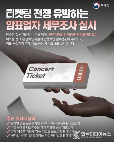 [ 한국미디어뉴스 이원영 기자 ] 단순한 질서 위반의 수준을 넘어 '국민 개개인의 정당한 권리를 빼앗으며' 이득을 챙겨 온 암표업자들의 관행적인 탈루행위에 주목하고, 이를 근절하기 위해 강도 높은 세무조사를 실시합니다.